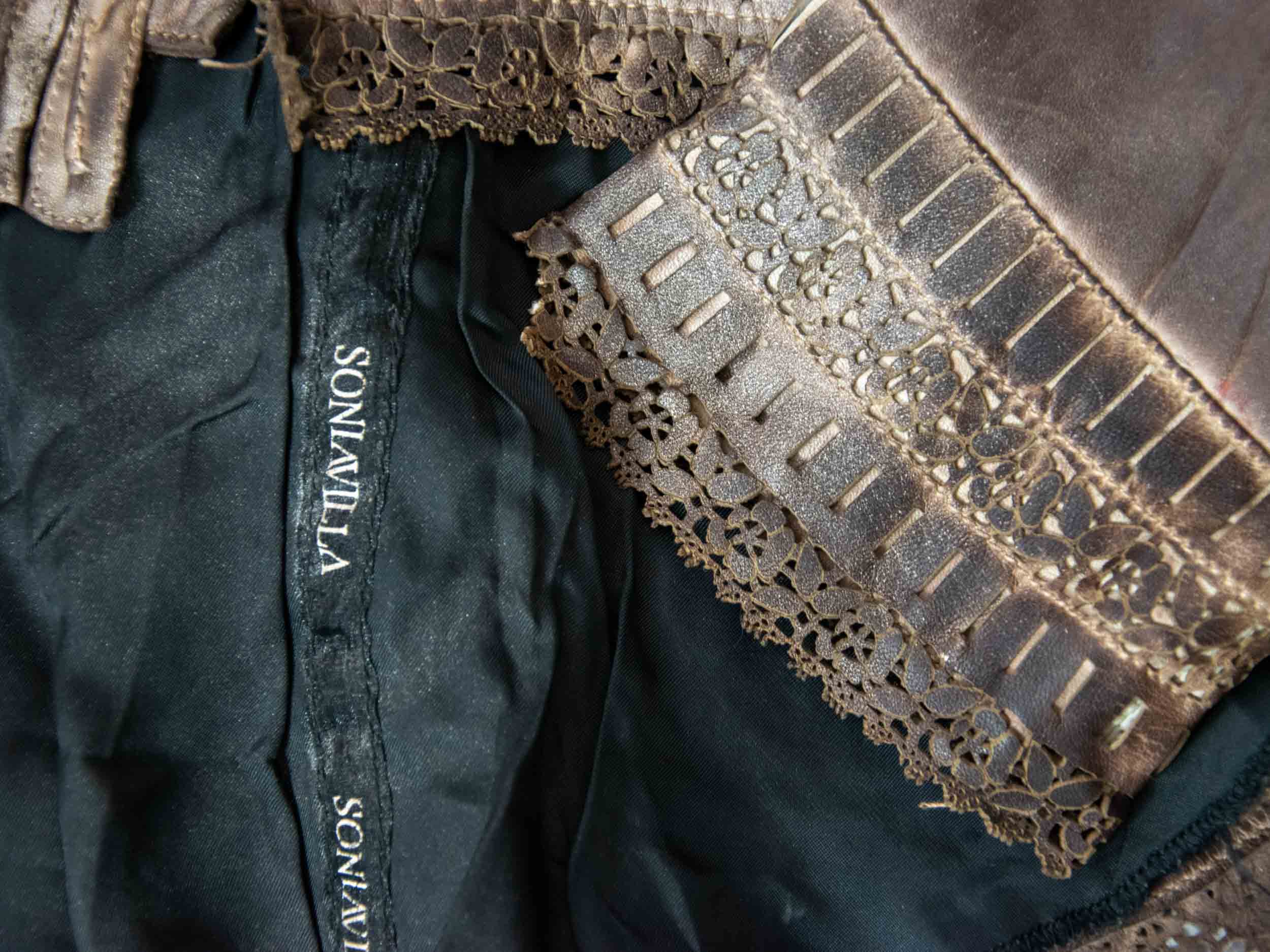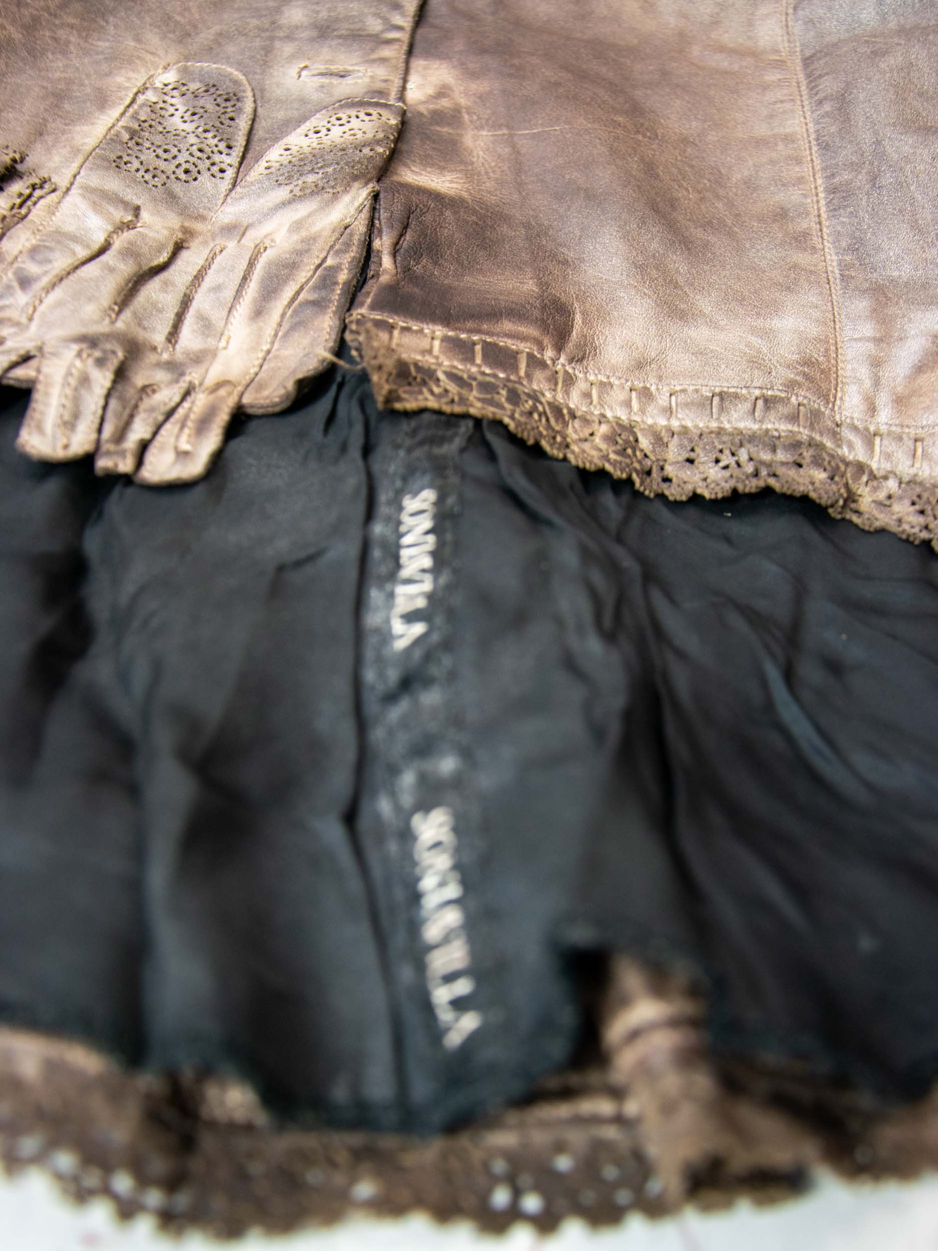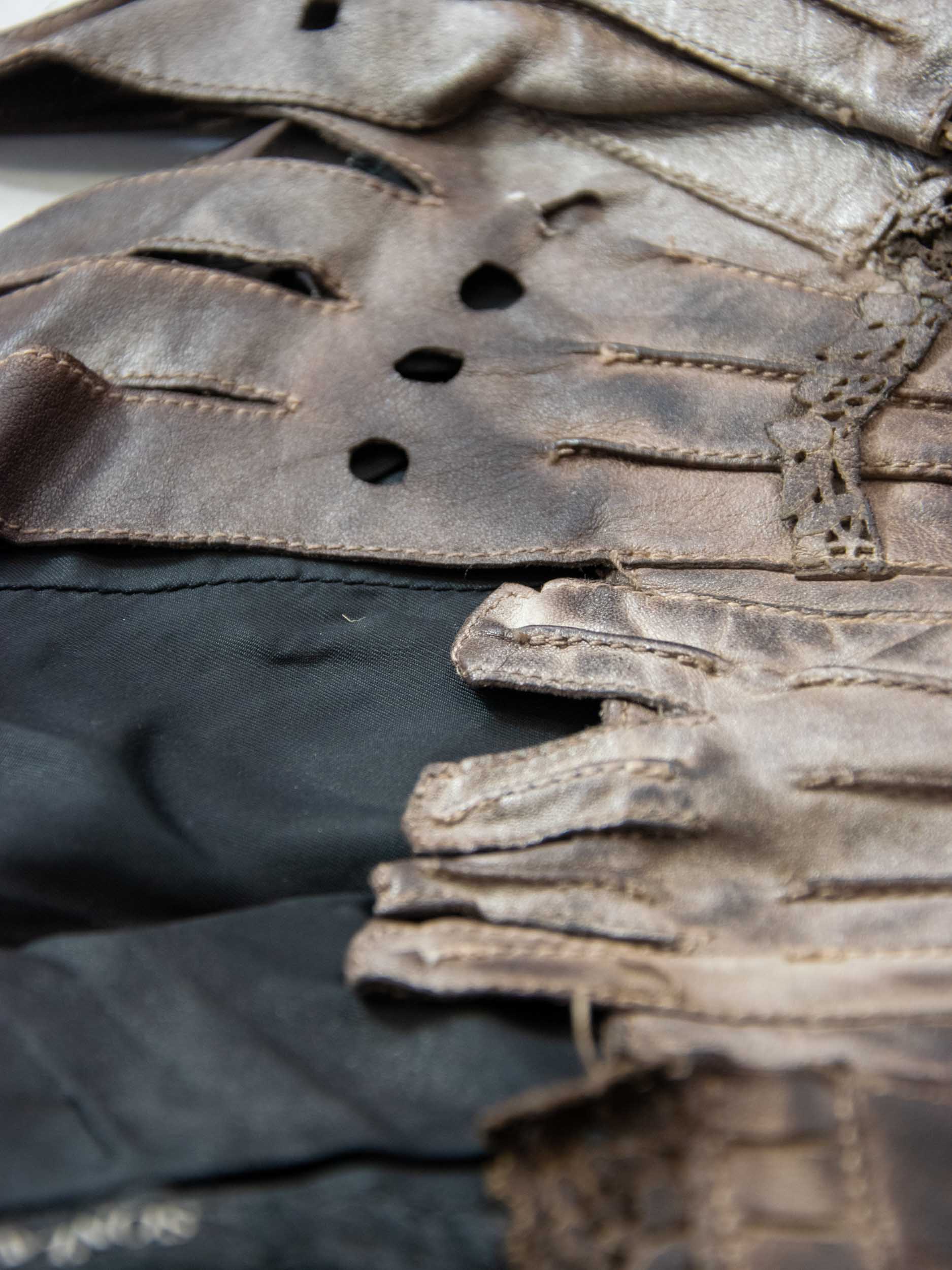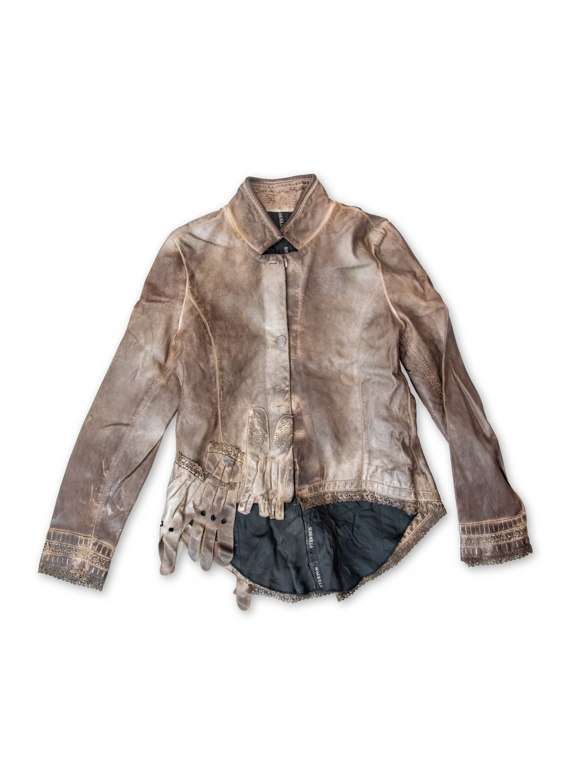 Asymmetrical women's jacket inspired by military uniforms and the silhouette of the redingote, reinterpreted with a contemporary twist. Its distinctive feature lies in the decorative gloves applied to the garment, intricately cut, engraved, and laser-etched to create a striking material and visual impact. Made from garment-dyed leather in a bark tone with subtle metallic highlights that catch the light elegantly. One-of-a-kind piece, size 38..