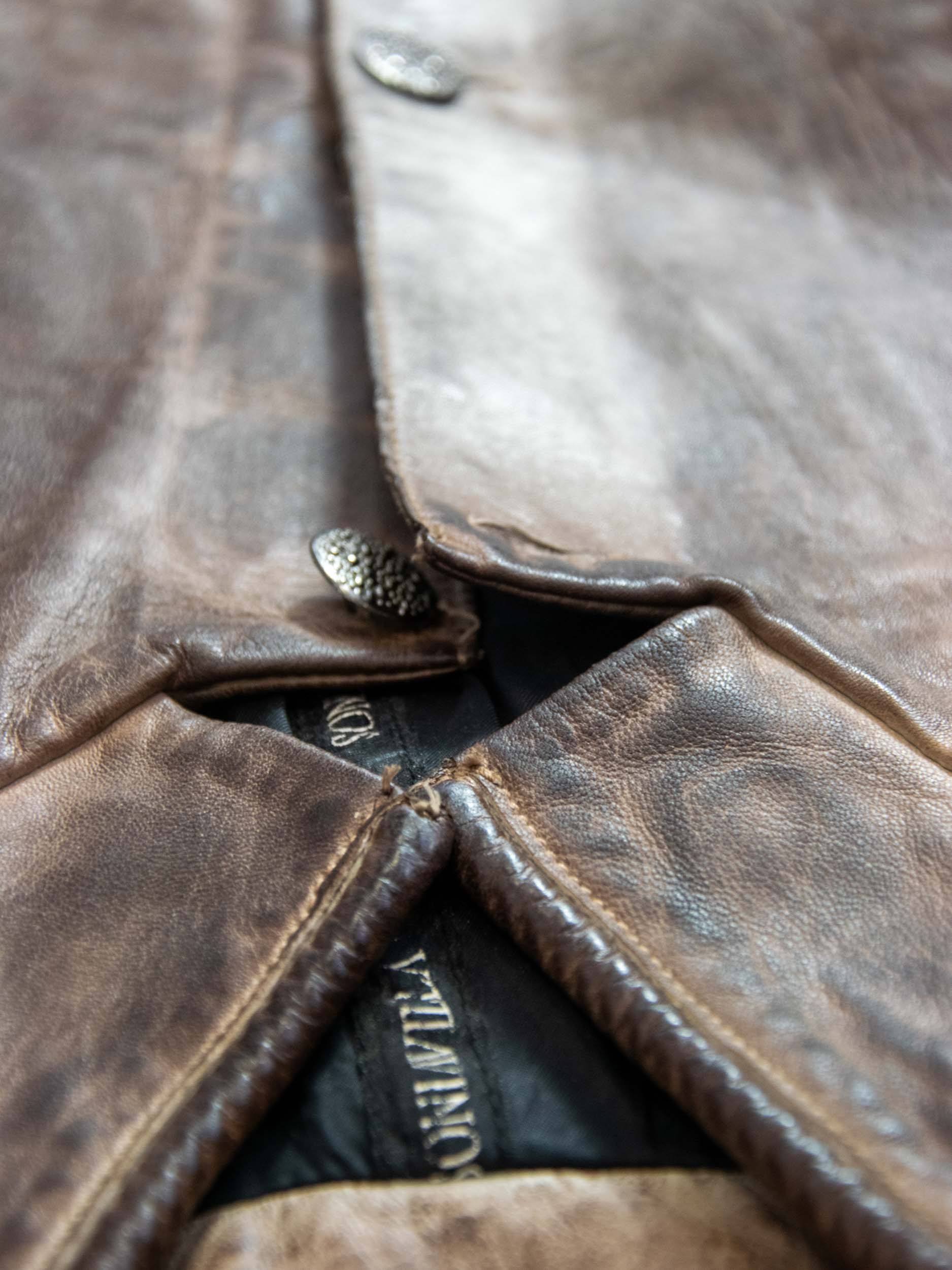 Dry clean only at specialized leather care facilities. If exposed to water or rain, dry away from direct heat sources. Store in a cool, dry place, preferably inside a breathable garment bag.