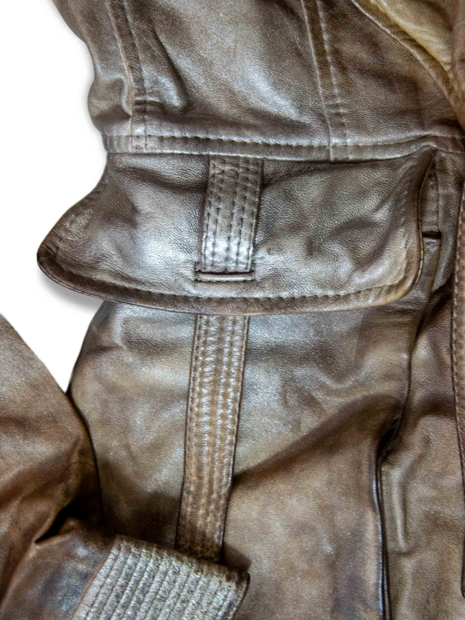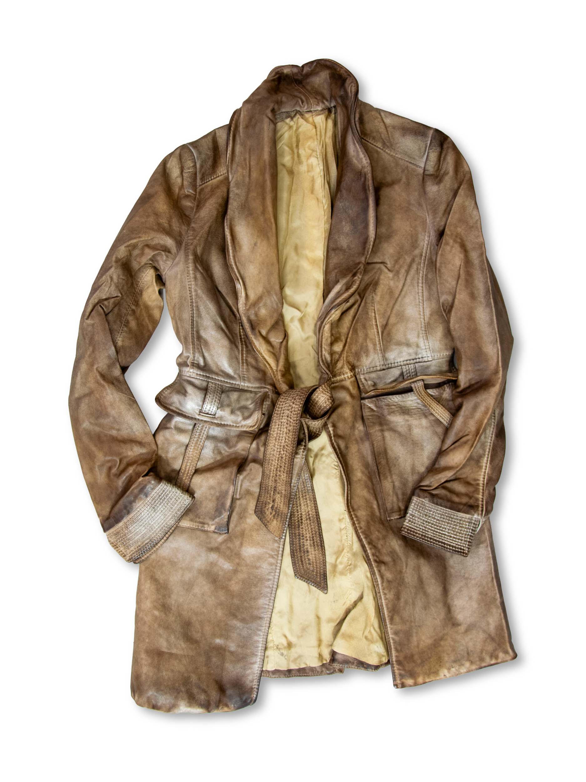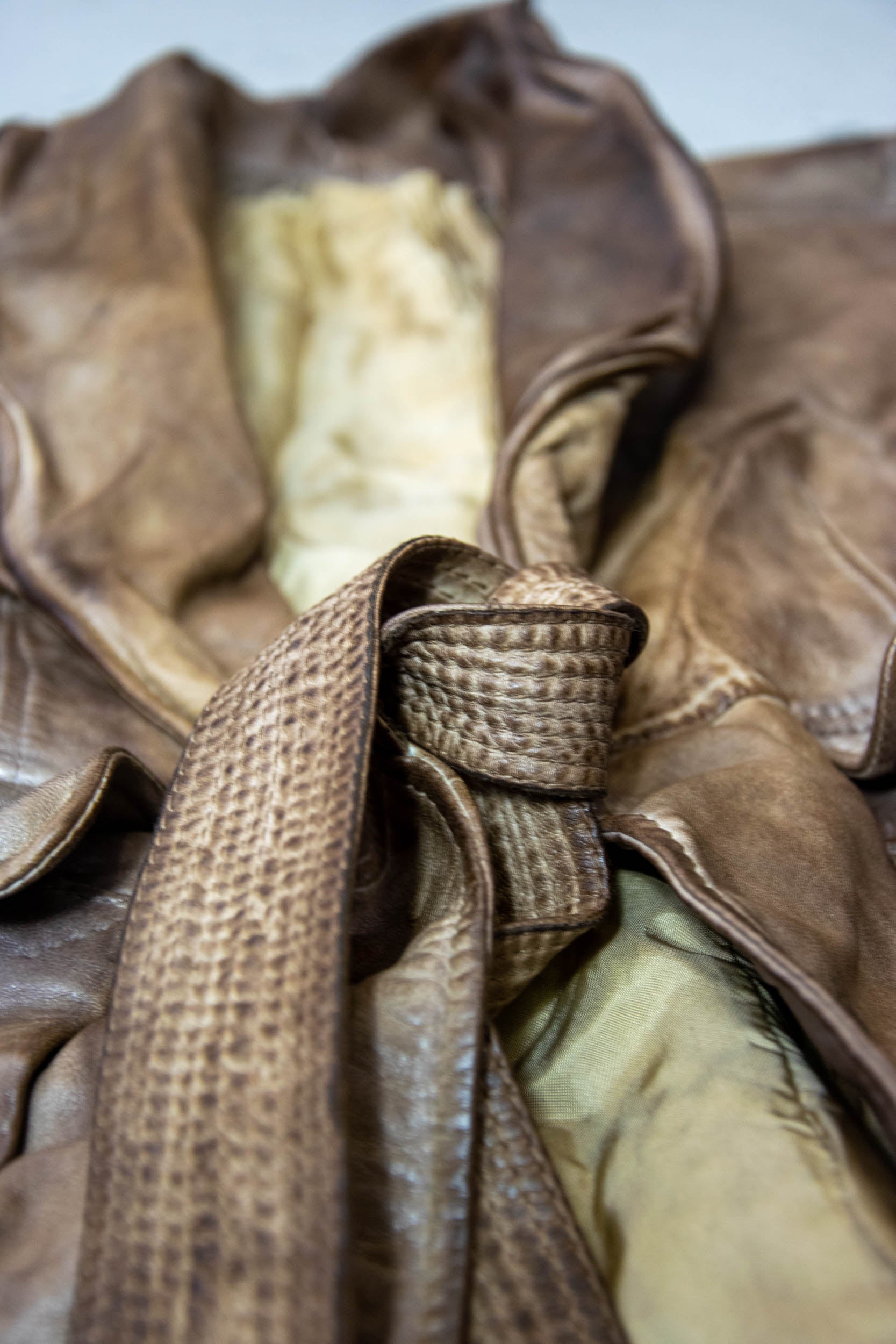 Long women’s jacket inspired by the classic sahariana, reinterpreted with a contemporary cut and technical detailing. A fine metallic core inserted into the seams allows for shaping of the collar and flaps, offering a personalized, sculptural silhouette. Crafted in garment-dyed leather in a tobacco hue with metallic reflections. Unique piece, available in size 40.