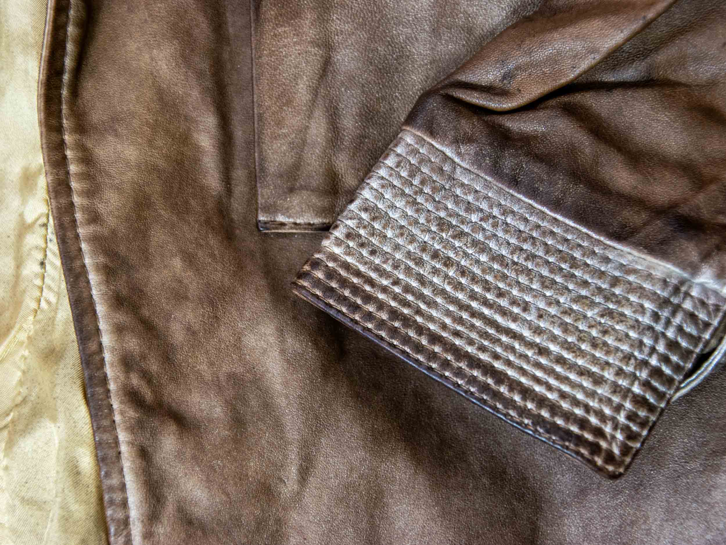 Dry clean only at specialized leather care facilities. In case of humidity or rain, dry naturally away from direct heat sources. Store in a cool, dry place, preferably in a breathable garment bag to protect the metallic finish.