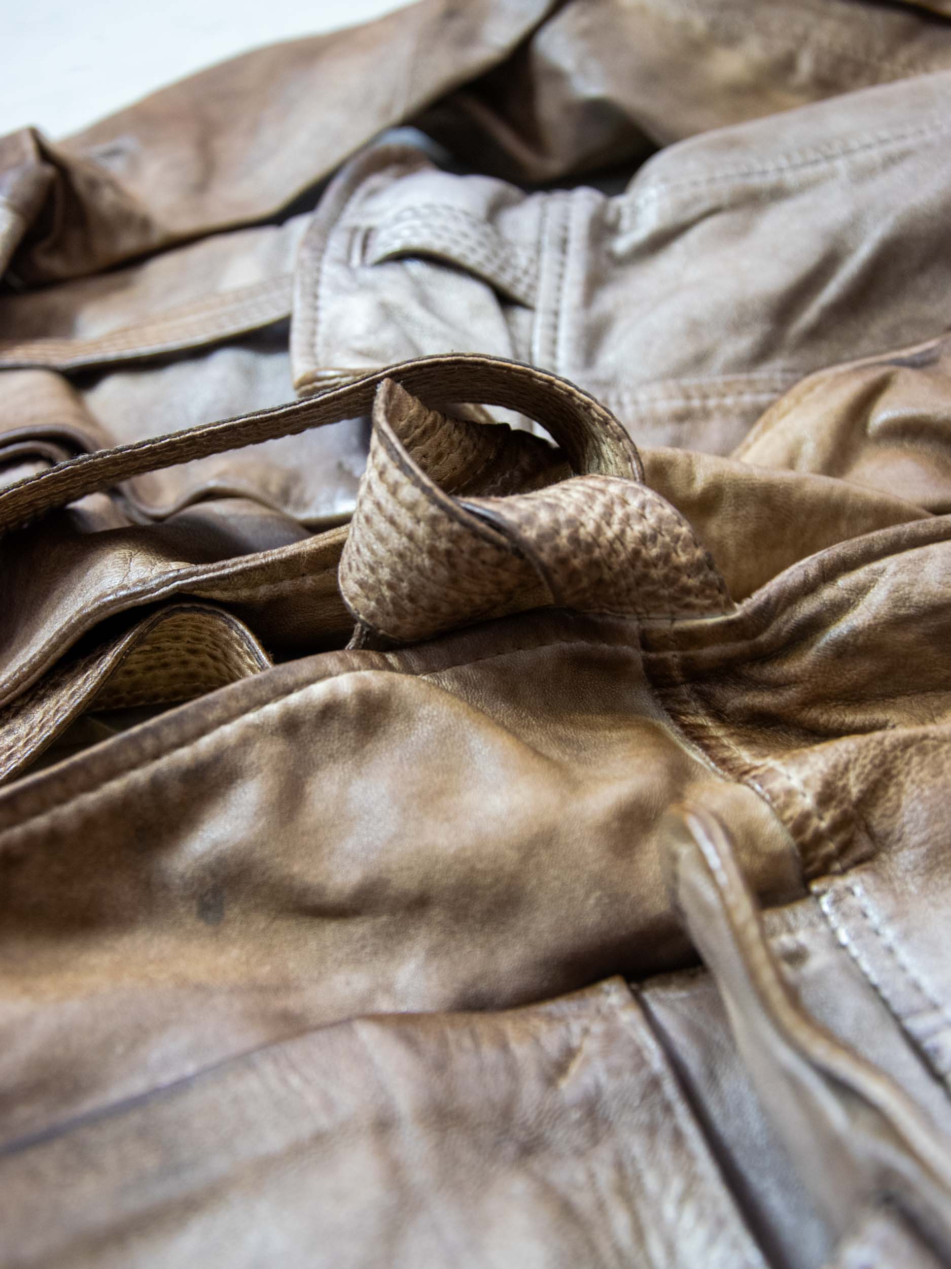 Garment-dyed leather with metallic finishes. Structural seams are reinforced with a metal core to enable shape customization. The piece is finished with artisanal techniques, enhancing the material’s texture and depth.