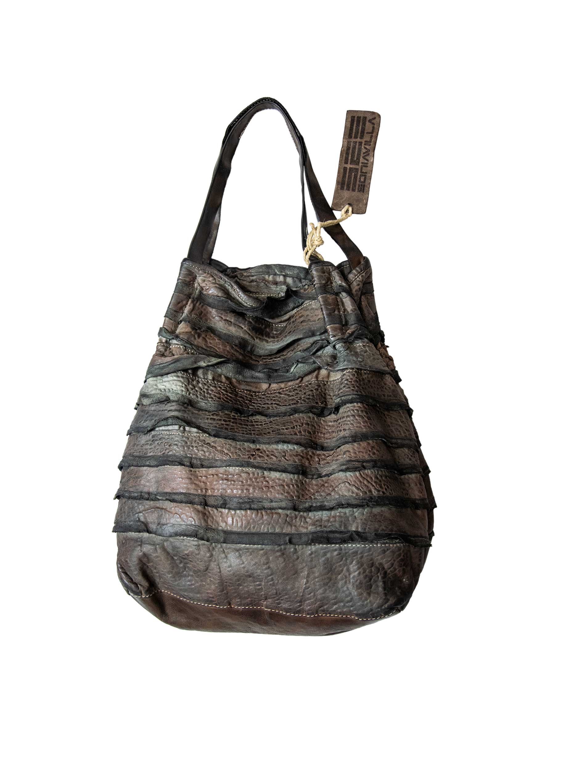 Soft lines, an organic texture, and a deep chocolate tone define this shopper bag in vegetable-tanned leather. The open design, free of closures, conveys a relaxed elegance, while the long handles allow for comfortable wear under the arm. The bark-effect finish adds visual and tactile depth, enhancing the artisanal character of the piece.